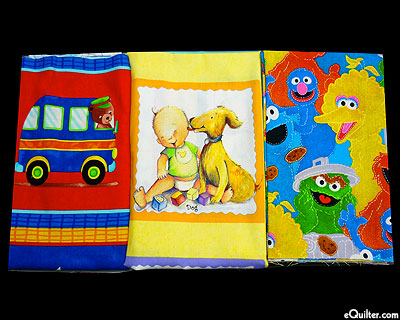 eQuilter's Scrap Packs are bolt ends from about 9” wide to 17” wide (average 11” wide), possibly including a panel, carefully sorted by color and/or theme, and assembled into a one pound package. This is a fantastic way to enhance the variety of your stash with quality fabrics – a delightful surprise in every packet! One pound is about 2 to 2 1/2 yards of total fabric. Enter quantity of 1-pound packages you would like to purchase in the quantity box. Fabrics are folded, stacked and tied with a fabric ribbon – great for gifts and door prizes. All sales are FINAL, no exceptions. PLEASE NOTE: Shipping price is based on weight, not price. One pound packet of *assorted* Baby themed scraps.