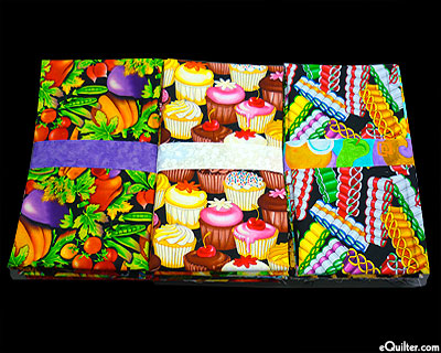 eQuilter's Scrap Packs are bolt ends from about 9” wide to 17” wide (average 11” wide), and may contain one panel. They are carefully sorted by color and/or theme, and assembled into a one pound package. This is a fantastic way to enhance the variety of your stash with quality fabrics – a delightful surprise in every packet! One pound is about 2 to 2 1/2 yards of total fabric. Enter quantity of 1-pound packages you would like to purchase in the quantity box. Fabrics are folded, stacked and tied with a fabric ribbon – great for gifts and door prizes. All sales are FINAL, no exceptions. PLEASE NOTE: Shipping price is based on weight, not price. One pound packet of food, kitchen, coffee, tea and wine themed scraps.