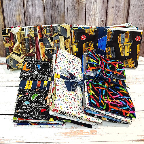 eQuilter's Scrap Packs are bolt ends from about 9” wide to 17” wide (average 11” wide), possibly including a panel, carefully sorted by color and/or theme, and assembled into a one pound package. This is a fantastic way to enhance the variety of your stash with quality fabrics – a delightful surprise in every packet! One pound is about 2 to 2 1/2 yards of total fabric. Enter quantity of 1-pound packages you would like to purchase in the quantity box. Fabrics are folded, stacked and tied with a fabric ribbon – great for gifts and door prizes. All sales are FINAL, no exceptions. PLEASE NOTE: Shipping price is based on weight, not price. One pound packet of Education and Book-themed scraps, assorted.