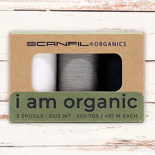 This lint-free, double mercerized 100% organic cotton thread is spun from the finest long staple Pima cotton, grown without the use of chemicals and pesticides. Each spool is wound around biodegradable wooden spool cores. Rest assured your thread is GOTS - Global Organic Textile Standards and Oeko Tex-certified. During production only natural dyes, natural lubrication and a very stringent mercerizing process are used. Perfect for quilting, top-stitching, decorative machine stitches, crafting, and embroidery and fits all standard sewing machine spindles. Included colors are Bright White, Limestone, and Jet Black. Recommended needle is US size 10-14. Achromatics thread set, 3 spools of 500 yds, 50 weight, 100% Organic extra long staple Pima Cotton by Scanfil.