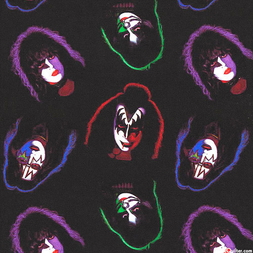 Dark portraits of members of the band KISS are tossed atop this rock and roll fabric, the rich colors back-lighting them making them almost glow. Larger portraits are about 2", 'Kissed' from the 'KISS' collection by ©2020 KISS Catalog, Ltd, Under License to Epic Rights, for Springs. This product is intended for home use only, not for manufacturing.