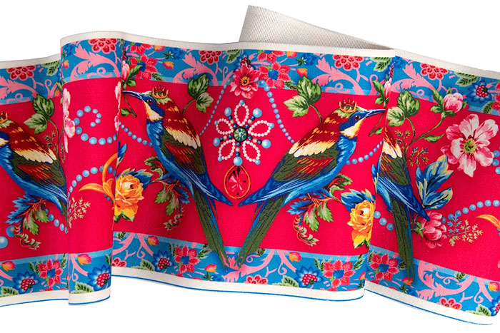 This velvet border is full of bright, saturated colors with an amazingly soft texture featuring strings of pearls and birds perched on colorful flowers. These digitally printed velvet borders are soft to the touch with ornamental designs and ornate details that create a sumptuous effect. The soft texture is perfect for tote bags, purses, clothes, or cushions. You can also create your own patchwork fabric or add these borders for a touch of texture on your next project! 100% polyester printed velvet border, 5" wide, 'The Queen's Garden on Pink' by Odile Bailloeul for Renaissance Ribbons. Made in France.