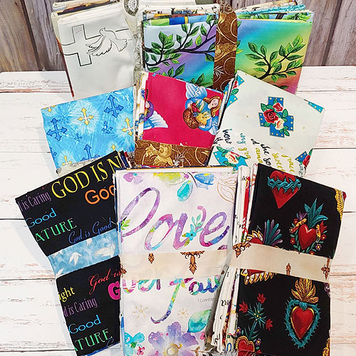 eQuilter's Scrap Packs are bolt ends from about 9” wide to 17” wide (average 11” wide), possibly including a panel, carefully sorted by color and/or theme, and assembled into a one pound package. CURRENT BATCH INCLUDES 2-3 PANELS PER PACKET. This is a fantastic way to enhance the variety of your stash with quality fabrics – a delightful surprise in every packet! One pound is about 2 to 2 1/2 yards of total fabric. Enter quantity of 1-pound packages you would like to purchase in the quantity box. Fabrics are folded, stacked and tied with a fabric ribbon – great for gifts and door prizes. All sales are FINAL, no exceptions. PLEASE NOTE: Shipping price is based on weight, not price. One pound packet of Christian-themed scraps, assorted.
