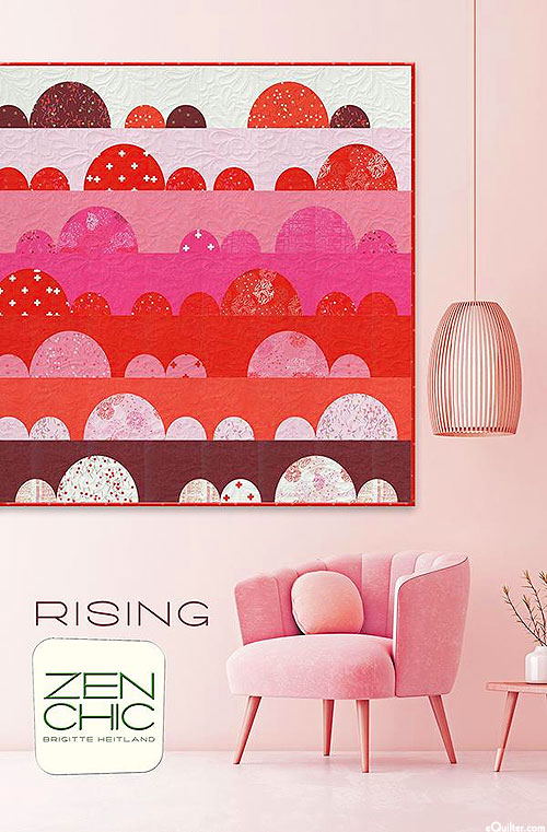 Just like a sun rise, let your imagination come popping up with this fun design and gradient of colors. This pattern utilizes applique to create this lively quilt design. Material Requirements include: An assortment of fat eighths in reds and pinks; 5/8 yd Ivory; 5/8 yd Lt. Pink; 5/8 yd Candy Pink; 5/8 yd Hot Pink; 5/8 Yd Red; 5/8 yd Cayenne; 5/8 yd Wine Red; 3-1/2 yds for backing; 1/2 yd for binding; 61" x 61" piece batting. 'Rising' quilt pattern by Brigitte Heitland for Zen Chic. Finished size is about 57" x 57".