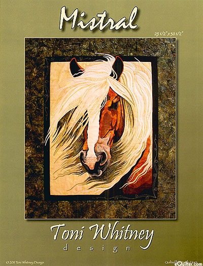 A stunning horse with a windswept mane is the centerpiece of this stunning quilt pattern. The raw edge fusible appliqué method allows even the ambitious beginner to achieve this beautiful design filled with life and movement. Color card included in pattern. Fabric Requirements: 3/4 yd plus 8" x 10 green/gold print; 9" x 10" green/gold dot; 10'x 15" sage green; 16" x 22" cream w/sage print; 12" x 22" creamy white;10" x 14" white; 4" x 4" tan; 8" x 8" rust; 9" x 12" rust w/gold; 6" x 7" medium brown; 8" x 10" dark brown; 9" x 10" gray w/black; 1/6 yd plus 10" x 11" black;2 3/4 Lite Steam A Seam; 30" x 35" low loft batting; 30" x 35" backing. 'Mistral' pattern by Toni Whitney Design, finished pattern is about 25 1/2" x 30 1/2".