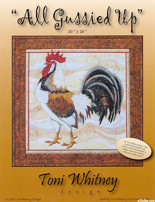 This handsome rooster would be proud to preside over your kitchen or country home. Or, turn this raw edge appliqué wall hanging sized block into the centerpiece for a farm theme quilt. Material requirements include: Assorted fabrics 1/3 yd or less including (5) neutrals, (2) golds, (4) rust reds, (2) dk blues, one gray and one black; 25"x 25" backing and batting; 1 1/2 yd fusible web; 7"x 11" white Mistyfuse or equivalent; and 17" x 17" plus 9" x 10" PFD Muslin. 'All Gussied Up' quilt pattern by Toni Whitney Design. Finished size is about 20" x 20".