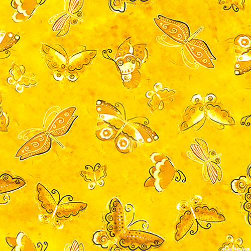 Illustrated butterflies with stylized wings flutter around this textured background as they form a kaleidoscope with the rest of their brethren. Larger butterflies are about 2-1/2", 'Flutterbyes' from the 'Kindred Canines' collection by Laurel Burch for Clothworks.