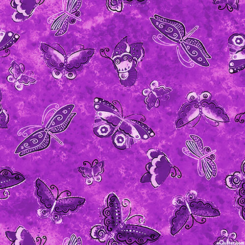Illustrated butterflies with stylized wings flutter around this textured background as they form a kaleidoscope with the rest of their brethren. Larger butterflies are about 2-1/2", 'Flutterbyes' from the 'Kindred Canines' collection by Laurel Burch for Clothworks.