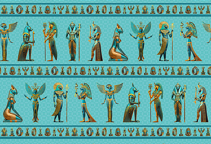 A variety of Egyptian gods are majestically posed against an intricate textural background including Osiris, Isis, Horus, Anubis, Bastet, Ra, and Thoth. Digitally printed, taller Egyptian stripes are about 7", stripes run the length of the fabric, includes four stripes from selvedge edge to selvedge edge, 'Egyptian Gods Stripe' by the Rubin Design Studio, designed exclusively for eQuilter.