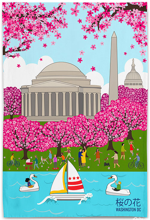 Groups of people enjoy a beautiful day in Washington DC along the Potomac River as the vibrant cherry blossom trees bloom vividly with the Lincoln Memorial in the background. 'DC Cherry Blossom at Potomac River' Tea Towel. 20" x 28", 100% cotton. Digitally printed in the USA. Machine washable in cold water with mild soap. Low heat or hang to dry.