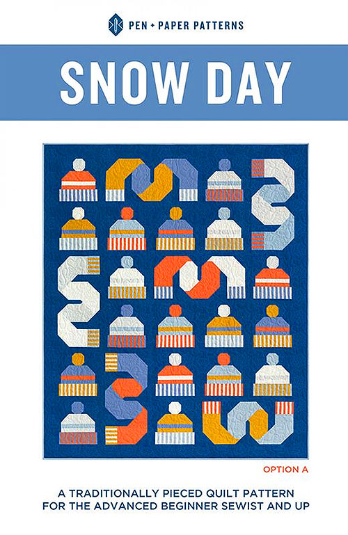 This charming quilt pattern features cozy hats and scarves - making it the perfect quilt to bundle up in when you emerge from the bitter cold of winter. 2 design options available- Option A: a quilt top featuring hats and scarves, and Option B: a quilt top featuring just hats! Material Requirements for Option A: 3/4 yd of (6) different colors for hats & scarves; 3-1/4 yds for background; 4-7/8 yds for backing; and 5/8 yd for binding. Requirements for Option B: 5/8 yd of (6) different colors for hats; 3-1/4 yds for background; 4-7/8 yds for backing; and 5/8 yd for binding.'Snow Day' pattern by Pen + Paper Patterns. Finished size is about 66" x 78".