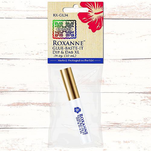 Instead of pinning, "Glue-Baste" your appliqué work, quilt pieces, bindings and hems. With the soft-tipped applicator, treating small areas or drawing fine lines is easy. Glue becomes tacky immediately, dries in 3 to 5 min. Holds firmly until moistened or washed out with soapy water, even after ironing. Roxanne Glue-Baste-It Dip & Dab, temporary basting glue, with applicator wand, 0.34 oz. (10 ml). 100% water soluble, pH neutral, dries clear and flexible.