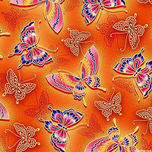 Vibrant butterflies flutter to and fro against a mottled background of richly vivid hues. Larger butterflies are about 1-3/4", from the 'Asian Garden II' collection by Oasis Fabrics.