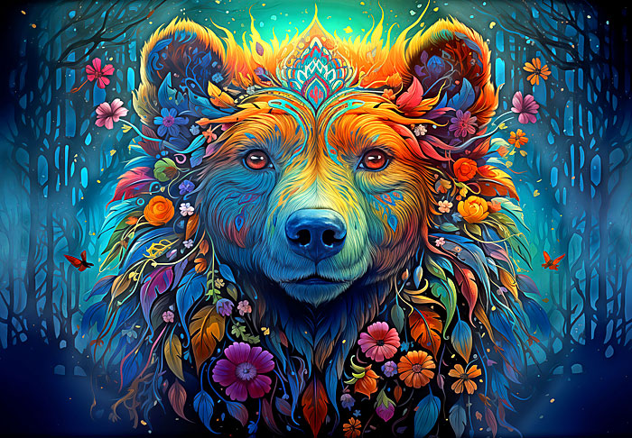 The captivating face of an intricately adorned bear emerges from delicately illustrated patterns reminiscent of those found in mandalas and zentangle designs. Digitally printed, 29" panel, 'Mysterious Bear' by the Rubin Design Studio, designed exclusively for eQuilter.