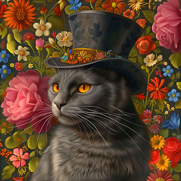 This classy kitty oozes charm and elegance with a classic Victorian top hat surrounded in luscious florals. Digitally printed, 43" panel, 'Stylish Victorian Kitty' by the Rubin Design Studio, designed exclusively for eQuilter.