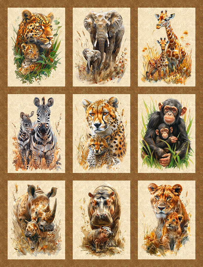 An adorable assortment of various pairs of mother and babies are depicted across this wild and whimsical panel including elephants, lions, giraffes, monkeys, hippos, zebras, and leopards. Digitally printed, 33" panel, includes nine 9-1/2" x 13" frames, 'Mother & Baby Safari Animals Panel' by the Rubin Design Studio, designed exclusively for eQuilter.