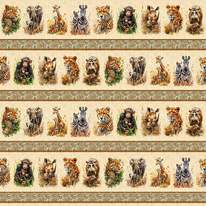 An adorable assortment of various pairs of mother and babies are depicted across this wild and whimsical design including elephants, lions, giraffes, monkeys, hippos, zebras, and leopards. Digitally printed, taller mother & baby animal stripes are about 6-1/4", stripes run the length of the fabric, includes four stripes from selvedge edge to selvedge edge, 'Mother & Baby Safari Animals Stripe' by the Rubin Design Studio, designed exclusively for eQuilter.
