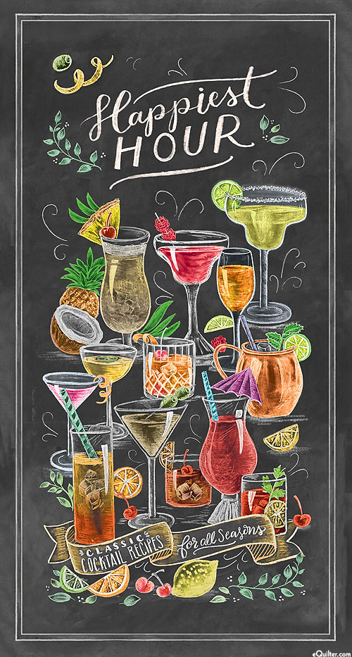 An elegant chalk drawing features an elegant spread of colorful cocktails laid out across this charming panel. Digitally printed, 24" panel, 'Happiest Hour Panel' from the 'Happiest Hour' collection by Lily & Val for Michael Miller Fabrics.