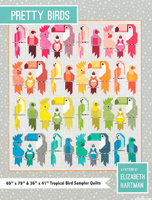 Tropical birds of all sizes, shapes and colors all in a row on their perches are crafted from traditional piecing. Small quilt has 2 rows of 5 birds, large quilt has 5 rows of 8 birds. Fabric requirements include: Small Quilt - 10 fat quarters (18" x 21" each), 1/4 yd white solid detail, 1/8 yd dark solid detail, 1/8 yd perch detail, 1-1/2 yds background, 40" x 41" batting, 1-1/4 yds backing, 3/8 yd binding; Large Quilt - 40 fat quarters (18" x 21" each), 3/8 yd white solid detail, 1/8 yd dark solid detail, 3/8 yd perch detail, 4-1/2 yds background, 73" x 83" batting, 4-7/8 yds backing, 5/8 yd binding. 'Pretty Birds' quilt pattern by Elizabeth Hartman. Finished sizes: Small Quilt - 36" x 41", Large Quilt - 69" x 79".