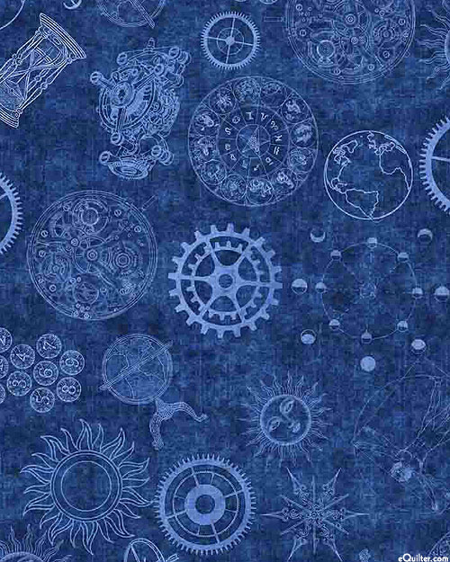 A detailed schematic contains an eclectic mix of drawings including renditions of lunar phases, the zodiac, the earth, hourglasses, and intricate pieces of machinery. Digitally printed, larger clocks are about 2-3/4", from the 'Like Clockwork' collection by Dan Morris for Quilting Treasures.