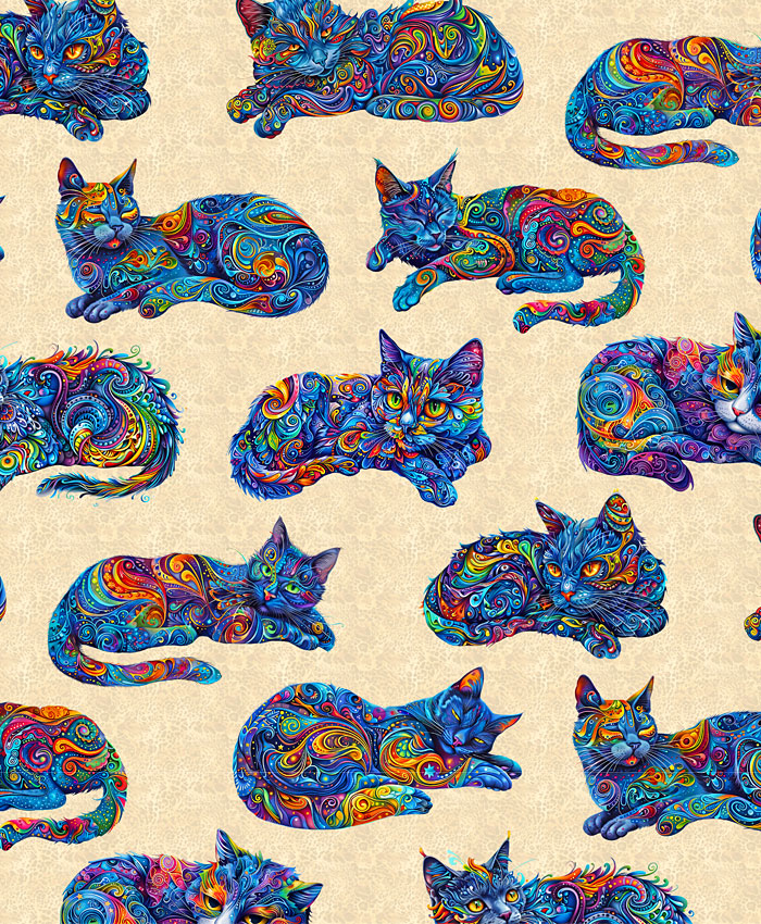 Cozy kitties delicately illustrated in patterns reminiscent of those found in mandalas and zentangle designs are scattered across the design. Digitally printed, kitties are about 5", 'Paisley Kitties' by the Rubin Design Studio, designed exclusively for eQuilter.