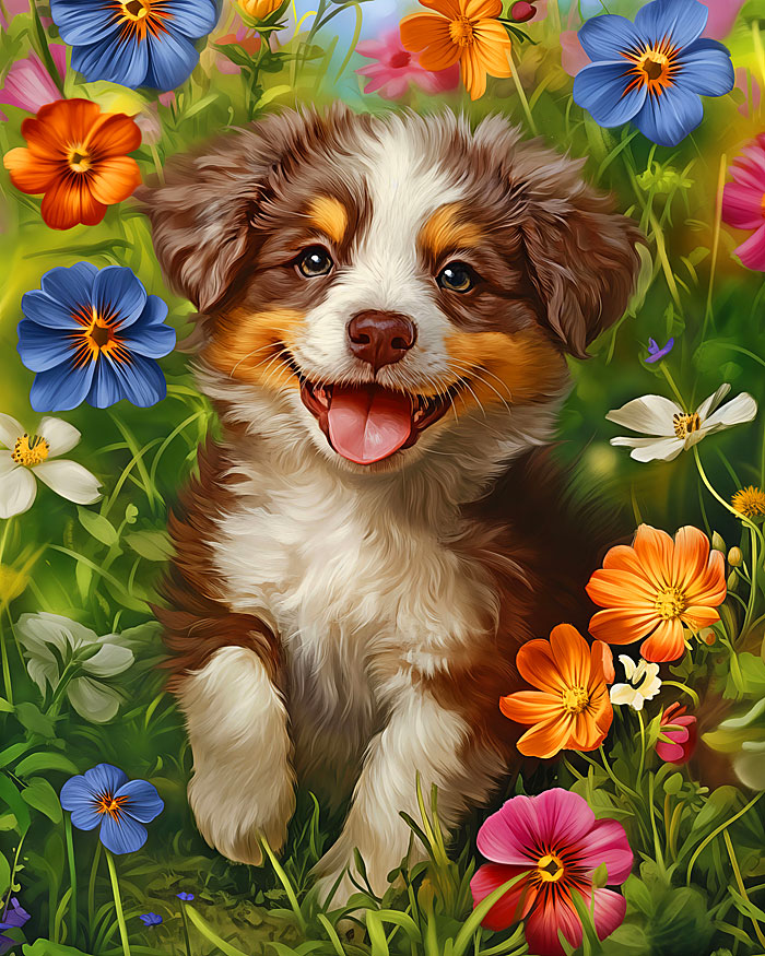 A playful Australian Shepherd puppy pokes their head through the verdant foliage of the forest in this cute and cuddly panel. Digitally printed, 34" panel, 'Puppy Heaven Australian Shepherd' by the Rubin Design Studio, designed exclusively for eQuilter.