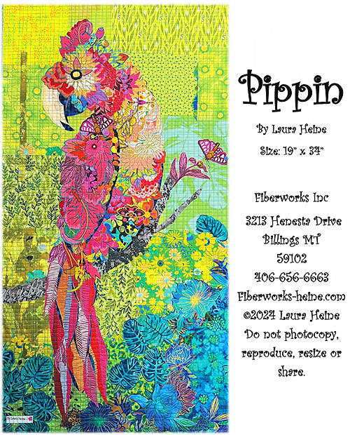 Floral and tropical motifs coalesce to create the image of vibrant Parrot in this newest collage pattern by Laura Heine. Material Requirements Include: 6" square of (3) different very light peach fabrics with slight print for beak; 6" square of solid black for beak and outline of wing; 6" square of dark blue with lighter splotchy blues for the beak and outline of wing and tail; 12" x 22" of large scale floral print (focus) with pink flowers and green leaves for the parrot; 6" x 10" of four additional medium to large scale florals with lighter values than aforementioned fabric; 6" x 10" of green/blue fabric with leaves for teh head (must coordinate with above fabrics); 10" x 10" of fabric with large scale yellow fabrics for the body; 6" x 22" of dark background floral fabric with butterflies for lower tummy; 6" x 10" of scallop fabric in light pink; 6" square of large black circle for eye; 10" x 10" fabric that can be cut to look like tail feathers; 6" square of dark gray for feet; 5" x 10" of gray/black fabric for the branch; 2/3 yards total o fat least (11) different green fabrics for the backgrounds. Fabrics should all coordinate and have a tropical feel to them. Sizes can range from 6" squares to about 6" x 10". 12" x 10" of dark blue fabric with tropical flowers for background cuttables; (2) additional dark blue floral or leaf fabrics for background and cuttables; 6" x WOF of fabric for binding; 20" Pattern Ease Foundation; 3 yards of 24' wide Steam a Seam 2 (eQuilter Product WAST5524); and 3/4 yds of fabric for the backing. 'Pippin' quilt pattern by Laura Heine of Fiberworks inc. Finished size is about 19" x 34".