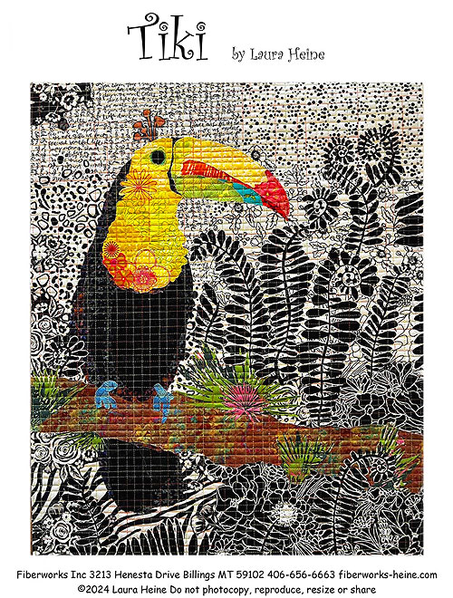 In this unique applique pattern you will find a neutral background allowing for tropical splashes of color to really pop as a vibrant toucan sits upon the branch of a tree. Material requirements Include: 9" x 10" of yellow fabric with large floral motifs for neck and floral cuttables; 6" square of three different yellow fabrics with slight print that coordinate with aforementioned fabric; 5" x 10" of black fabric with a slight print for body; 6" square of (4) additional black fabrics with a slight value or color change for body. One fabric should be dark black, The other three can be very dark purples, blues or an additional black. 6" square of (3) different orange to red fabrics for the beak; 6" square of teal fabric for beak; 6" square of green fabric with slight print for the beak and circle around the eye; 6" square of blue/teal fabric for feet; 6" square of fabric for the hat; 4" x 22" of brown fabric with a mossy print for the branch; 6" x 10" of fabric with green and pink spiky print for the branch; 5" x 10" of (6) different fabrics and one 6" x 10" of black and white fabrics for the backgrounds; 12" x 10" of one focal floral fabric with cuttable black flowers for the background; 5" x WOF of fabric for the binding; 20" of Pattern Ease Foundation; 3.5 yds of 12" wide Steam-a-Seam (eQuilter code: WAST5440); and .75 yds of fabric for the backing. 'Tiki' quilt pattern by Laura Heine of Fiberworks inc. Finished size is about 18-1/2" x 22-1/2".