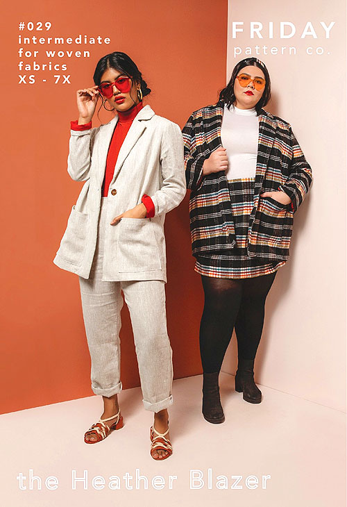 The Heather is an unstructured, modern blazer. This comfortable and stylish jacket has a slightly oversized fit and can be worn in all seasons. It is the perfect editorial layering piece. This pattern is designed to be approachable for the beginner sewist. If you have always wanted to dip your toe into making outerwear but have felt intimidated, this is a great place to start! Material Requirements Include: Main Fabric - XS-M 2.4 yds 45" wide OR 1.9 yds 54"-60" wide; L-XXL 2.8 yds 45" wide OR 2.2 yds 54"-60" wide; 1X-4X 3.2 yds 45" wide OR 2.5 yds 54"-60" wide; 5X-7X 3.6 yds 45" wide OR 3.1 yds 54"-60" wide. Lining Fabric- XS-M 1.8 yds 45" wide OR 1.6 yds 54"-60" wide; L-XXL 2.1 yds 45" wide OR 1.6 yds 54"-60" wide; 1X-4X 2.4 yds 45" wide OR 2 yds 54"-60" wide; 5X-7X 3 yds 45" wide OR 2.4 yds 54"-60" wide. Woven Interfacing: XS-M .9 yds 45" wide; L-XXL 1 yd 45" wide; 1X-4X 1.3 yds 45" wide; 5X-7X 1.4 yds 45" wide. Knit Interfacing: XS-XXL .9 yds 45" wide; 1X-7X 1.1 yds 45" wide. Notions: (1) 3/4-1" Sized Button. 'The Heather Blazer' pattern by Friday Pattern Co., sizes XS-7X.