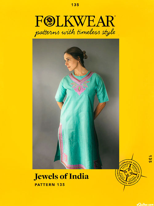 A grouping of truly versatile garments with a tailored Kurta overshirt for men and women, Kamiz tunic and bias-cut Churidar pants for women. The simple shapes of these garments make it easy to vary them creatively. Top everything off with the Gandhi hat, a symbol of national pride since 1947. This pattern includes historical information about Indian dress. The Kurta, sized here for both men and women, is a mid-thigh, long-sleeved overshirt gently flared from the natural shoulder line, with side slits at the hem, neckband, placket, breast, and sideseam pockets. The front and back panels of the elegant Kamiz are perfect for showing off a gorgeous length of fabric or as a backdrop for your favorite jewelry. There are thigh-high slits in the side panels. Elbow-length sleeves are fitted by a small underarm gusset. Bias tape, self-fabric or purchased, finishes the inside of the jewel neckline and shoulder openings, which are fastened by bias loops and buttons. The Kamiz is offered in two lengths – above the knee and calf length. Fitting the bias-cut Churidar pants requires attention to your calf measurement, as they should be almost skin tight in that area. Cut very long, their graceful folds hide the ankle. They are extremely easy to make, and fitted at the waist by elastic or a drawstring. Churidar are meant to be worn under a thigh or calf-length tunic or dress. Suggested fabrics: For the Kurta, choose any shirting fabric from gauze to flannel. For the Kamiz and Churidar, choose light to medium-weight cottons, silks, or synthetics; lightweight wool. For the hat, choose medium-weight cotton, silk, or wool; decorative weaves or brocade. Jewels Of India pattern by Folkwear. Sized for men and women.