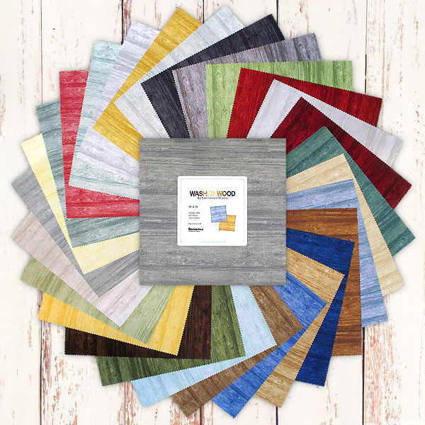 Nature-inspired colors of earth, sky, and water are enhanced by the wood-grained texture on these monochromatic tonal blenders. 'Washed Wood' collection pre-cut by Contempo Studio for Benartex, pack includes forty-two 10" x 10" squares.