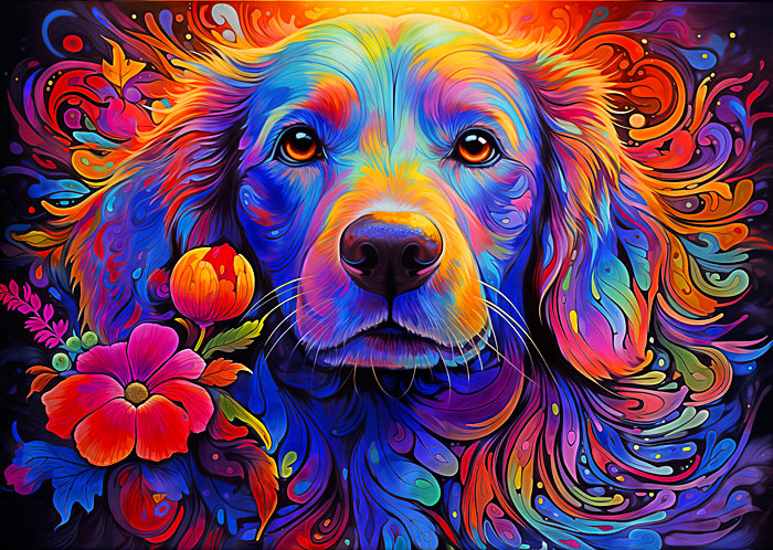 The captivating face of an intricately adorned Golden Retriever emerges from delicately illustrated patterns reminiscent of those found in mandalas and zentangle designs. Digitally printed, 29" panel, 'Mystical Golden Retriever' by the Rubin Design Studio, designed exclusively for eQuilter.