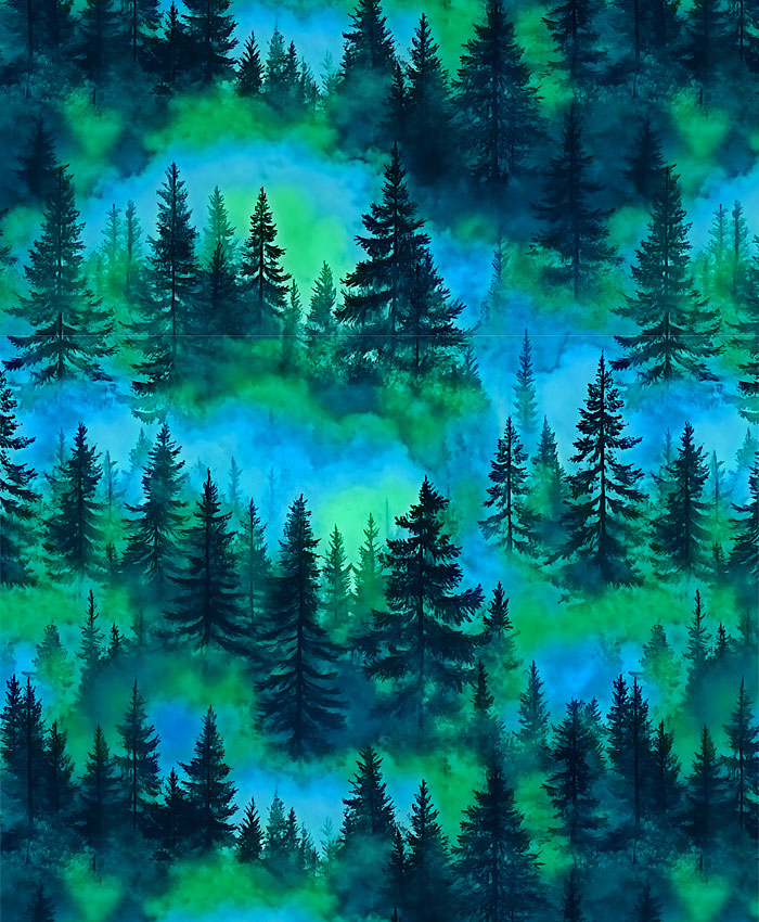 Vibrant waves of color come to life in a vivid landscape full of verdant mountain trees. 108" wide quilt backing, digitally printed, larger trees are about 4", 'Pine Forest Backing' by the Rubin Design Studio, designed exclusively for eQuilter.