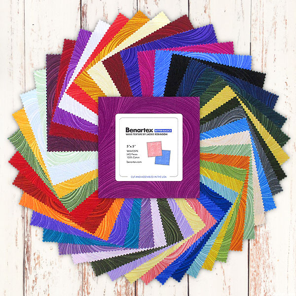 Here is a deal for your stash! A pre-cut packet containing a vibrant variety of tonals featuring an earthen gradient of sweeping wave textures in an expansive array of colors and shades to work with. 'Wave Texture' collection charm pack by Jackie Robinson for Benartex Fabrics, pack includes forty-two 5" x 5" squares.