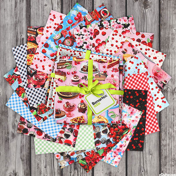 A summery set of fabulous fabrics come to life in this delightful pre-cut featuring delicate cherry blossom petals, gingham check tablecloths, and delectably ripe cherries. 'Cherry Hill' collection fat quarter pack by Benartex Fabrics. Pack includes nineteen fat quarters.