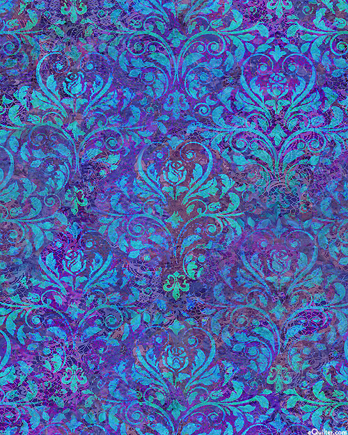 Elegant flourishes swirl and compliment one another atop this symmetrical design, resembling something you might find on wallpaper. Digitally printed, horizontal repeat is about 2-1/2", 'Peacock Damask Wallpaper' from the 'Flourish' collection by Timeless Treasures.