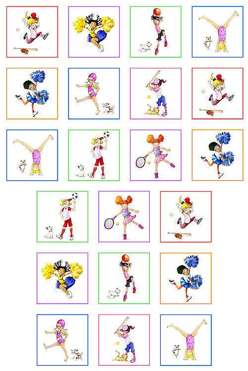 In this panel, athletic girls show off the skills of their various sports including basketball, soccer, baseball, softball, cheer leading, tennis, and swimming. 36" panel, panel has forty-two frames about 5" x 5", from the 'Girls Rule' collection by Joy Allen for Elizabeth's Studio. This image has been divided and stacked vertically to display the entire panel.