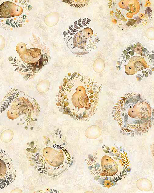 Adorable baby chicks waddling through the woods are scattered across the design with small chicken eggs tossed in the space between. Digitally printed, larger chicks are about 1-1/4", from the 'Cotton Tails' collection by Dan Morris for Quilting Treasures.