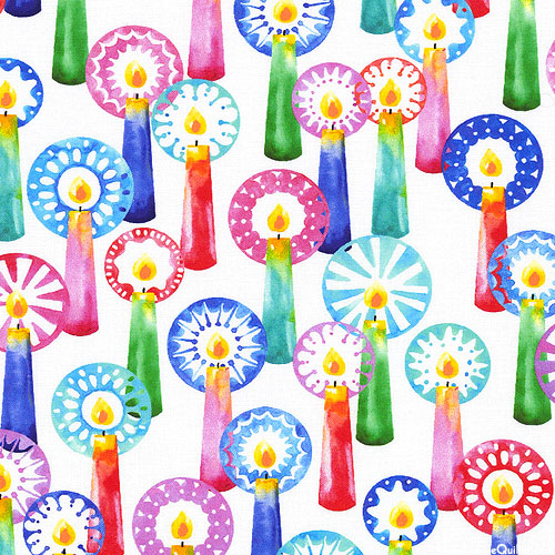 Shining Christmas candles are accented by intricate halos of color resembling mandalas. Christmas Candles are about 2-1/2", from the 'Wishwell: Afterglow' collection by Vanessa Lillrose & Linda Fitch for Robert Kaufman Fabrics.