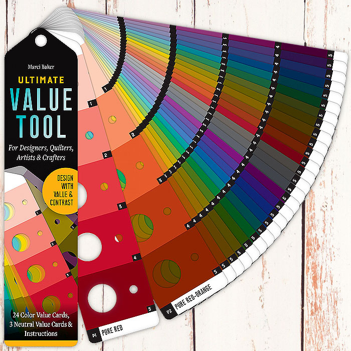 Elevate your design by using this instrumental color value tool! The Ultimate Value Tool is a set of 30 cards with five calibrated sections, spanning from lights to darks. Ideal for all crafters, place the closest matching color card on top of your chosen material and view through the 7/8" round die-cut "window" to help pinpoint the color value of any fabric or substrate. Use the small (1/4") round hole to isolate and determine the value of smaller items such as patterns, books, photos, etc. 'Ultimate Value Tool' set of 30 cards with five calibrated value sections, spanning from lights to darks, size 9-3/4" x 2-1/4", by C&T Publishing.