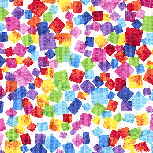 Multicolored squares are tossed all over this dazzling abstract design. Larger shapes are about 1/2", 'Vibrant Squares' by Hi-Fashion for Timeless Treasures.
