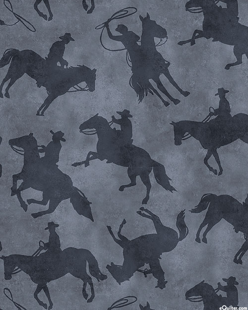 Silhouettes of horse-riding cowboys are scattered across the wild and Western design. Please prewash and allow for up to 7% shrinkage. 108" wide quilt backing, larger horses are about 3", 'Cowboys' from the 'Yellowstone 108"' collection by Kanvas Studio for Benartex Fabrics.