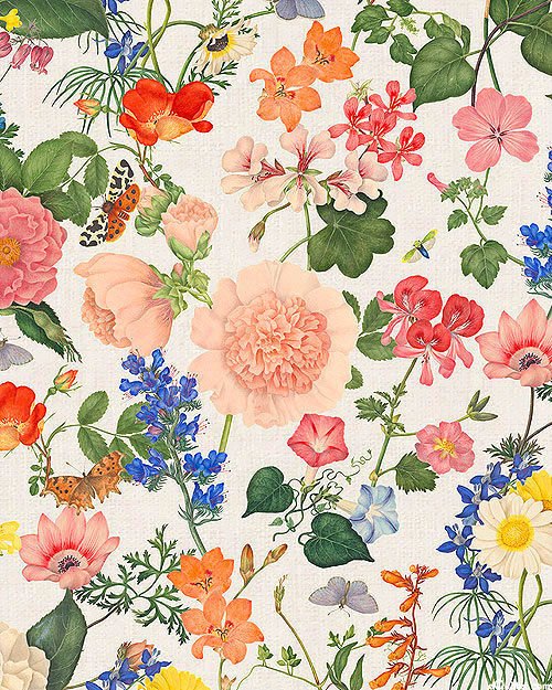 A lush landscape of flourishing flowers coalesce to create a captivating garden gala of texture and tone. 58/60" wide, 55% linen, 45% cotton, larger flowers are about 3", from the 'Nature's Portrait' collection by The Royal Horticultural Society for Riley Blake Designs. Trade marks of The RHS (Registered Charity No 222879/SC038262) used under license from RHS Enterprises Ltd.