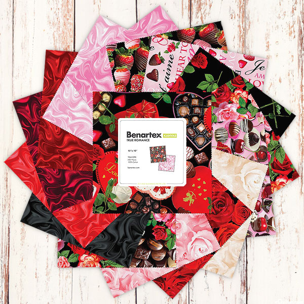 Romantic motifs of love and affection coalesce in this heartwarming pre-cut. 'True Romance' collection ten-square by Kanvas Studio for Benartex Fabrics. Pack includes forty-two 10" x 10" squares.