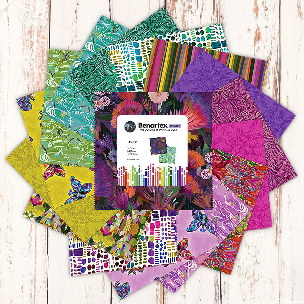 Wild butterflies and verdant jungle imagery coalesce to create a stunning pre-cut of rich and vivid hues. 'True Colors' collection ten-square by Danielle Duer for Benartex Fabrics. Pack includes forty-two 10" x 10" squares.