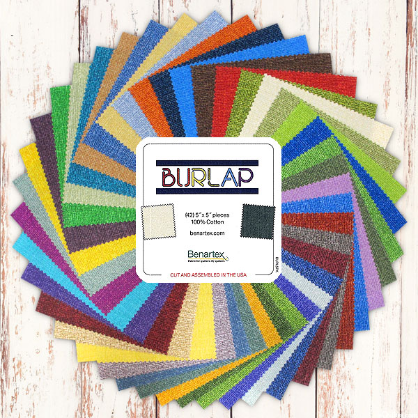 Solids are presented in a variety of vivid colors, making a versatile charm pack that can be used in a wide array of projects! 'Burlap' collection charm pack by Benartex Fabrics, pack includes forty-two 5" x 5" squares.