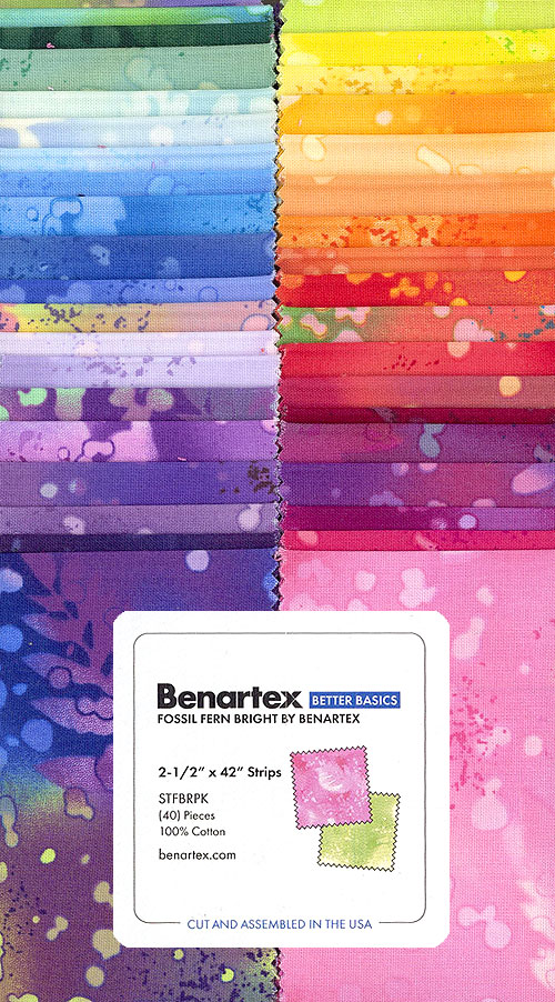 This bold and graphic pre-cut features vibrant designs full of color-bright abstract designs resembling a painter's drop cloth or artistic canvas. 'Fossil Fern Bright' collection strip pack by Benartex Fabrics, pack includes forty 2-1/2" x 42" strips.