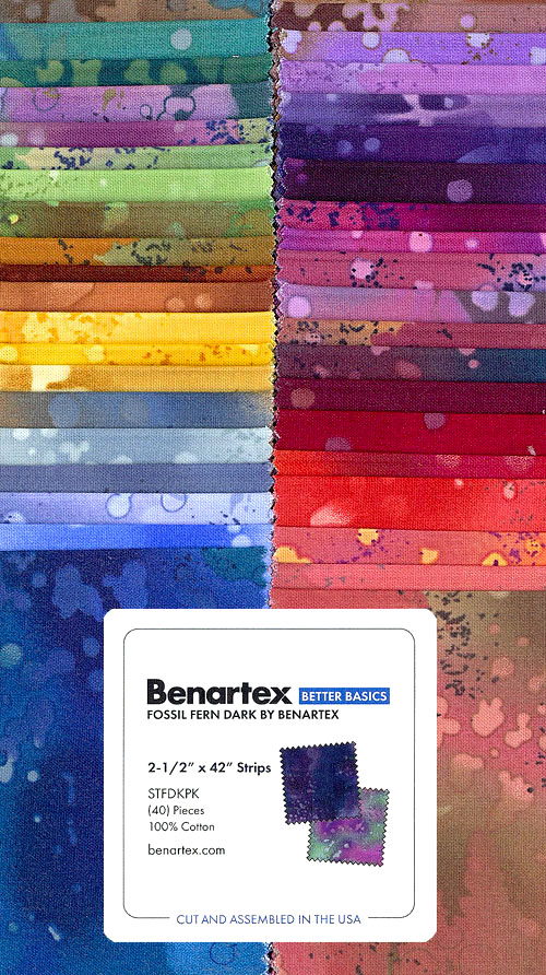 This bold and graphic pre-cut features vibrant designs full of color-bright abstract designs resembling a painter's drop cloth or artistic canvas. 'Fossil Fern Dark' collection strip pack by Benartex Fabrics, pack includes forty 2-1/2" x 42" strips.