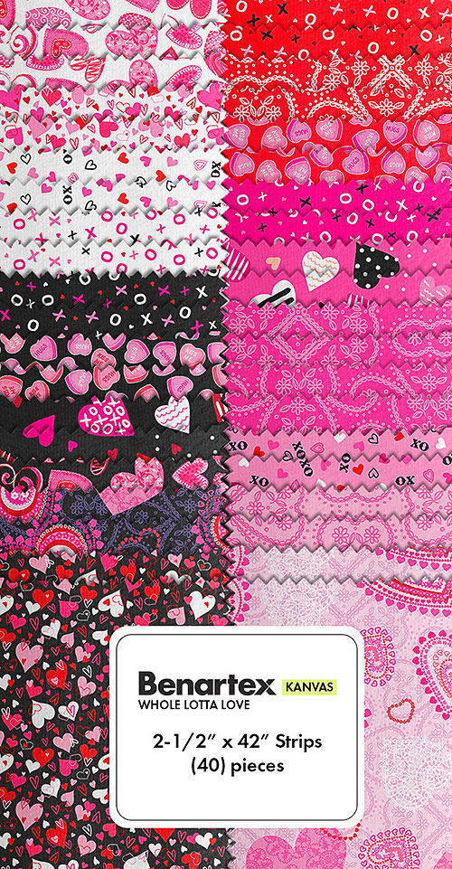 Romantic motifs of love and affection coalesce in this heartwarming pre-cut. 'Whole Lotta Love' collection strip pack by Kanvas Studios for Benartex Fabrics, pack includes forty 2-1/2" x 42" strips.