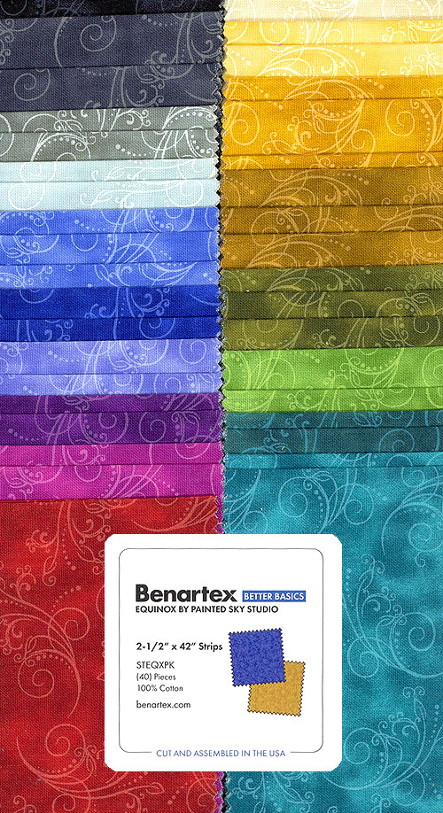 A simple pattern of swirly plant shapes is presented in a variety of vivid colors, making a versatile pre-cut that can be used in a wide array of projects! 'Equinox' collection strip pack by Painted Sky Studio for Benartex Fabrics, pack includes forty 2-1/2" x 42" strips.